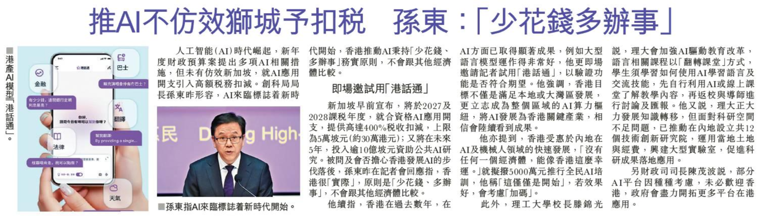 頭條日報 Headline Daily • 27/02/2026 推AI不仿效獅城予扣稅 孫東:「少花錢多辦事」 人工智能(AI)時代崛起,新年度財政預算案提出多項AI相關措施,但未有仿效新加坡,就AI應用開支引入高額稅務扣減。創科局局長孫東昨形容,AI來臨標誌着新時代開始,香港推動AI秉持「少花錢、多辦事」務實原則,不會跟其他經濟體比較。