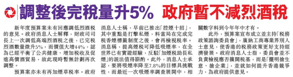 頭條日報 Headline Daily • 26/02/2026 調整後完稅量升5% 政府暫不減烈酒稅 新年度預算案未有回應調低烈酒稅的意見。政府消息人士解釋,財政司司長上一次調低高端烈酒稅之後,已完稅烈酒數量微升5%,而價值大增44%,認為已經平衡了公共健康、增加稅收及促進高價酒貿易,故此現時暫無計劃再次調整。