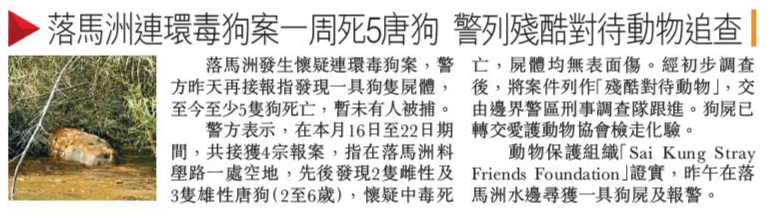 頭條日報 Headline Daily • 23/02/2026 落馬洲連環毒狗案一周死5唐狗 警列殘酷對待動物追查 落馬洲發生懷疑連環毒狗案,警方昨天再接報指發現一具狗隻屍體,至今至少5隻狗死亡,暫未有人被捕。