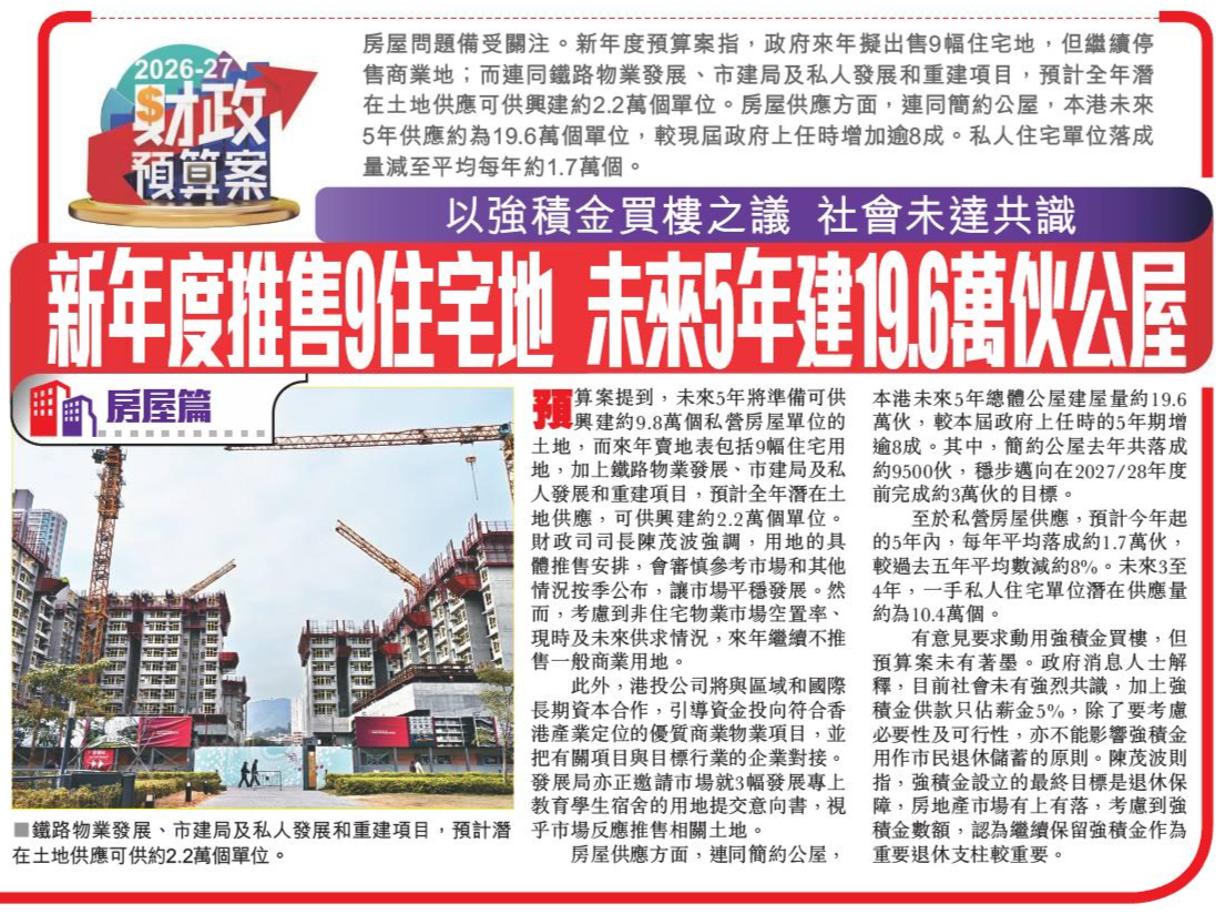 頭條日報 Headline Daily • 26/02/2026 以強積金買樓之議 社會未達共識 新年度推售9住宅地 未來5年建19.6萬伙公屋 房屋問題備受關注。新年度預算案指,政府來年擬出售9幅住宅地,但繼續停售商業地;而連同鐵路物業發展、市建局及私人發展和重建項目,預計全年潛在土地供應可供興建約2.2萬個單位。房屋供應方面,連同簡約公屋,本港未來5年供應約為19.6萬個單位,較現屆政府上任時增加逾8成。私人住宅單位落成量減至平均每年約1.7萬個。