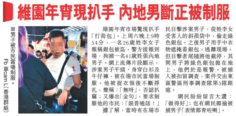 頭條日報 Headline Daily • 16/02/2026 維園年宵現扒手 內地男斷正被制服 維園年宵市場驚現扒手「打荷包」。上周六晚上9時54分,一名26歲姓李女子報稱銀包被盜,警方接報到場,拘捕一名41歲姓張內地男子。網上流傳片段顯示,涉案男子平頭、身穿白衫及牛仔褲,被在場市民當場制服。他被捉衣領後不斷掙扎,聲稱:「無呀」,否認扒竊;又爆出「金句」,要求制服他的市民:「說普通話!」