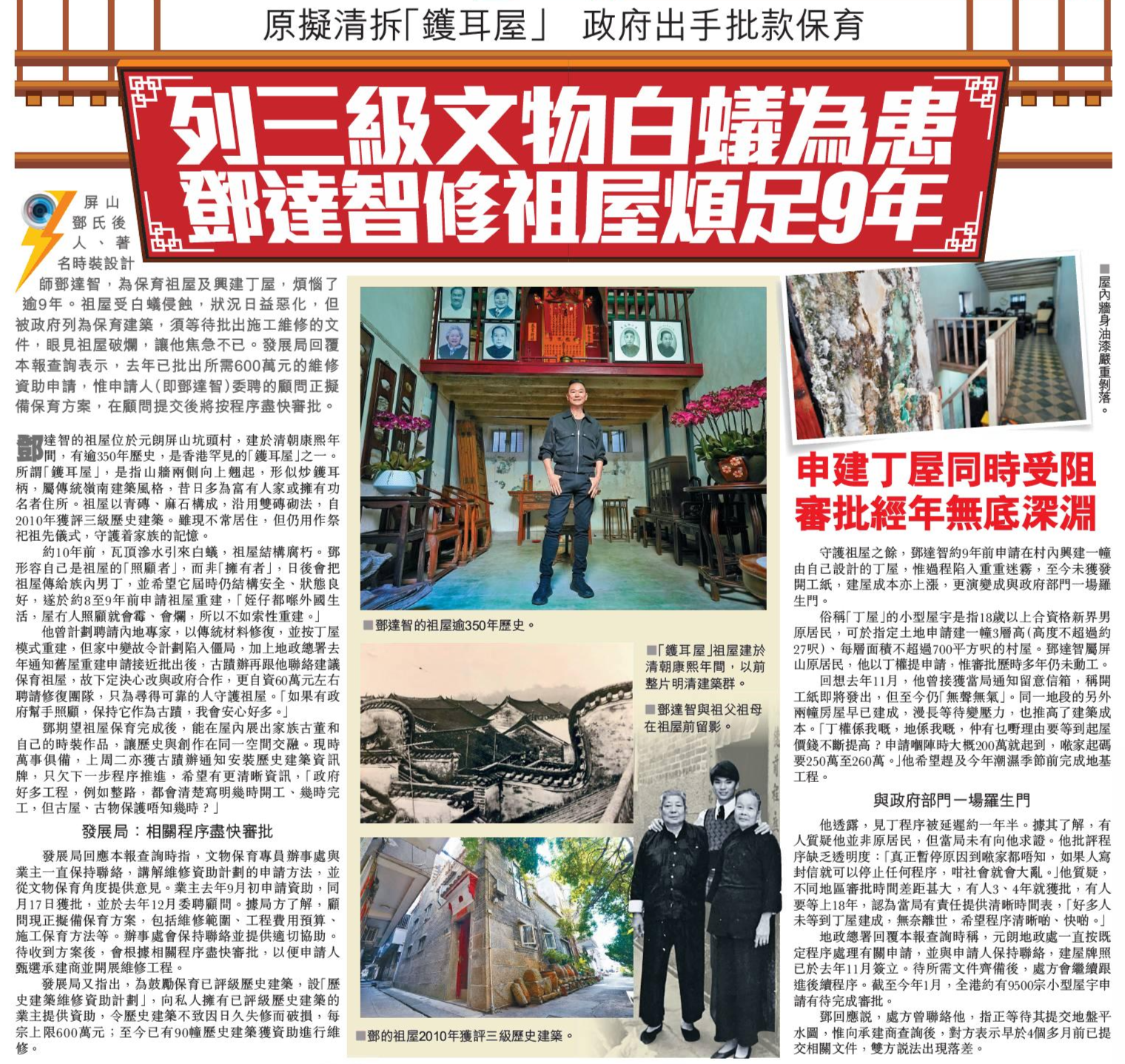 頭條日報 Headline Daily • 24/02/2026 原擬清拆「鑊耳屋」 政府出手批款保育 列三級文物白蟻為患 鄧達智修祖屋煩足9年 屏山鄧氏後人、著名時裝設計師鄧達智,為保育祖屋及興建丁屋,煩惱了逾9年。祖屋受白蟻侵蝕,狀況日益惡化,但被政府列為保育建築,須等待批出施工維修的文件,眼見祖屋破爛,讓他焦急不已。發展局回覆本報查詢表示,去年已批出所需600萬元的維修資助申請,惟申請人(即鄧達智)委聘的顧問正擬備保育方案,在顧問提交後將按程序盡快審批。