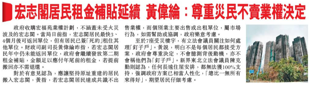 頭條日報 Headline Daily • 25/02/2026 宏志閣居民租金補貼延續 黃偉綸:尊重災民不賣業權決定 政府收購宏福苑業權計劃,不涵蓋未受火災波及的宏志閣。當局日前指,宏志閣居民最快3、4個月後可返回單位,但有居民已簽「死約」租住其他單位。財政司副司長黃偉綸昨指,若宏志閣居民年中仍未能返回單位,政府會繼續發放第二期租金補貼,金額足以應付年尾前的租金,若提前搬回亦不需退還。