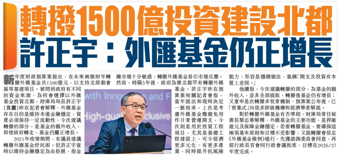 頭條日報 Headline Daily • 27/02/2026 轉撥5000億投資建設北都 許正宇:外匯基金仍正增長 新年度財政預算案提出,在未來兩個財年轉撥外匯基金共1500億元,以支持北部都會區等基建項目。被問到政府有不同的資金來源,為何會選擇以外匯基金投資北都,財庫局局長許正宇昨在記者會解釋,外匯基金存在目的是維持本港金融穩定,資產必須保持一定流動性,今次建議轉撥的部分,是基金的額外收入,即使政府轉走,基金仍屬正增長。