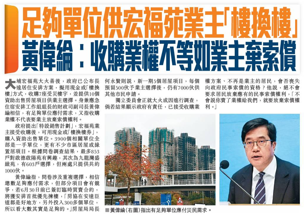 頭條日報 Headline Daily • 23/02/2026 足夠單位供宏福苑業主「樓換樓」 黃偉綸︰收購業權不等如業主棄索償 大埔宏福苑大火發生近3個月,政府上周六公布長遠居住安排方案,擬用現金或「樓換樓」方式,收購7座受災樓宇,並提供10個資助出售房屋項目供業主選擇。身兼應急住宿安排工作組組長的財政司副司長黃偉綸相信,有足夠單位應付需求;又指收購業權不代表要業主放棄索償權利。