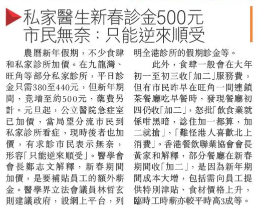 頭條日報 Headline Daily • 21/02/2026 私家醫生新春診金500元 市民無奈:只能逆來順受 農曆新年假期,不少食肆和私家診所加價。在九龍灣、旺角等部分私家診所,平日診金只需380至440元,但新年期間,竟增至約500元,藥費另計。