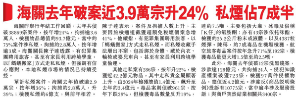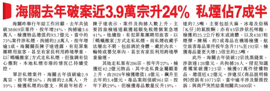 頭條日報 Headline Daily • 13/02/2026 海關去年破案近3.9萬宗升24% 私煙佔7成半 海關昨舉行年結工作回顧,去年共偵破38869宗案件,按年增24%,拘捕逾3.6萬人,檢獲物品總值約93.7億元。當中約75%案件涉私煙,拘捕約2.8萬人,按年增逾3成。海關關長陳子達透露,有犯罪集團聘用旅客,甚至有家長利用跨境學童,以「螞蟻搬家」方式走私私煙,但強調有信心應對,本地私煙市場的情況已持續受控。
