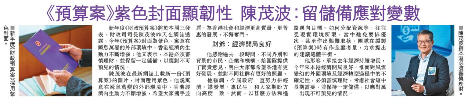 頭條日報 Headline Daily • 23/02/2026 《預算案》紫色封面顯韌性 陳茂波:留儲備應對變數 新年度《財政預算案》將於本周三發表。財政司司長陳茂波昨天在網誌透露,今年《預算案》封面為紫色,寓意在瞬息萬變的外部環境中,香港經濟內生動力不斷增強;他又表示,本港必須審慎理財,並保留一定儲備,以應對不可預見的情況。