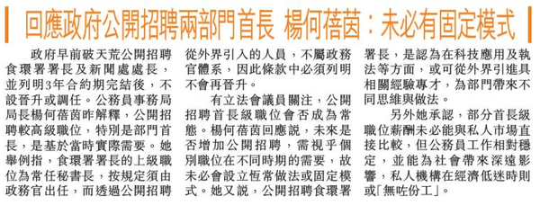 頭條日報 Headline Daily • 24/02/2026 回覆政府公開招聘兩部門首長 楊何蓓茵:未必有固定模式 政府早前破天荒公開招聘食環署署長及新聞處處長,並列明3年合約期完結後,不設晉升或調任。公務員事務局局長楊何蓓茵昨解釋,公開招聘較高級職位,特別是部門首長,是基於當時實際需要。