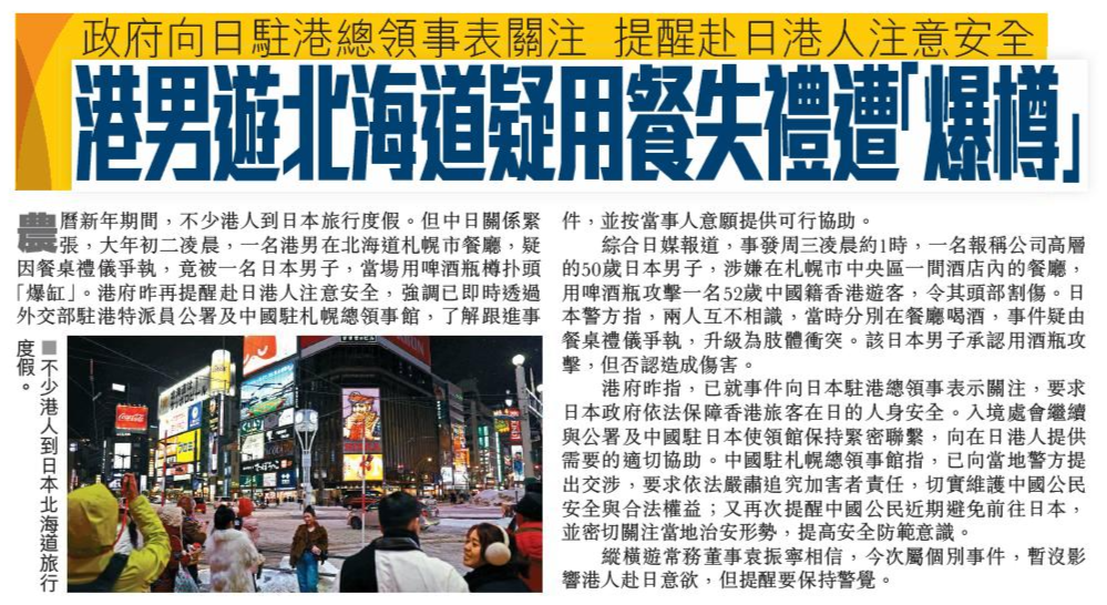 頭條日報 Headline Daily • 20/02/2026 政府向日駐港總領事表關注 提醒赴日港人注意安全 港男遊北海道疑用餐失禮遭「爆樽」 農曆新年期間,不少港人到日本旅行度假。但中日關係緊張,大年初二凌晨,一名港男在北海道札幌市餐廳,疑因餐桌禮儀爭執,竟被一名日本男子,當場用啤酒瓶樽扑頭「爆缸」。港府昨再提醒赴日港人注意安全,強調已即時透過外交部駐港特派員公署及中國駐札幌總領事館,了解跟進事件,並按當事人意願提供可行協助。