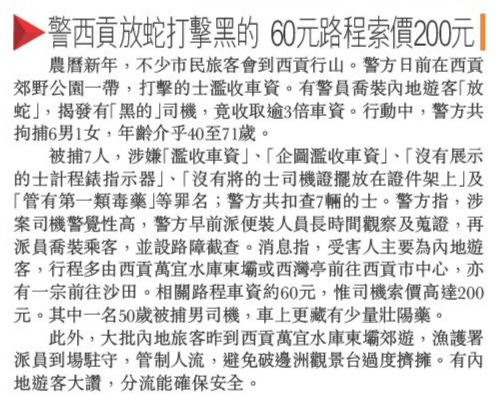 頭條日報 Headline Daily • 16/02/2026 警西貢放蛇打擊黑的 60元路程索價200元 農曆新年,不少市民旅客會到西貢行山。警方日前在西貢郊野公園一帶,打擊的士濫收車資。有警員喬裝內地遊客「放蛇」,揭發有「黑的」司機,竟收取逾3倍車資。行動中,警方共拘捕6男1女,年齡介乎40至71歲。