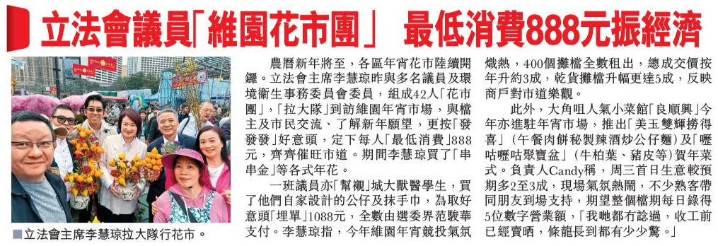 頭條日報 Headline Daily • 13/02/2026 立法會議員「維園花市團」 最低消費888元振經濟 農曆新年將至,各區年宵花市陸續開鑼。立法會主席李慧琼昨與多名議員及環境衞生事務委員會委員,組成42人「花市團」,「拉大隊」到訪維園年宵市場,與檔主及市民交流、了解新年願望,更按「發發發」好意頭,定下每人「最低消費」888元,齊齊催旺市道。期間李慧琼買了「串串金」等各式年花。