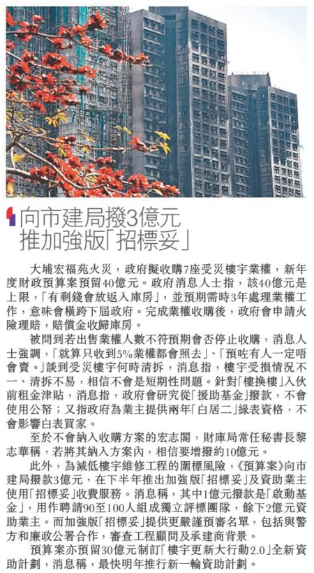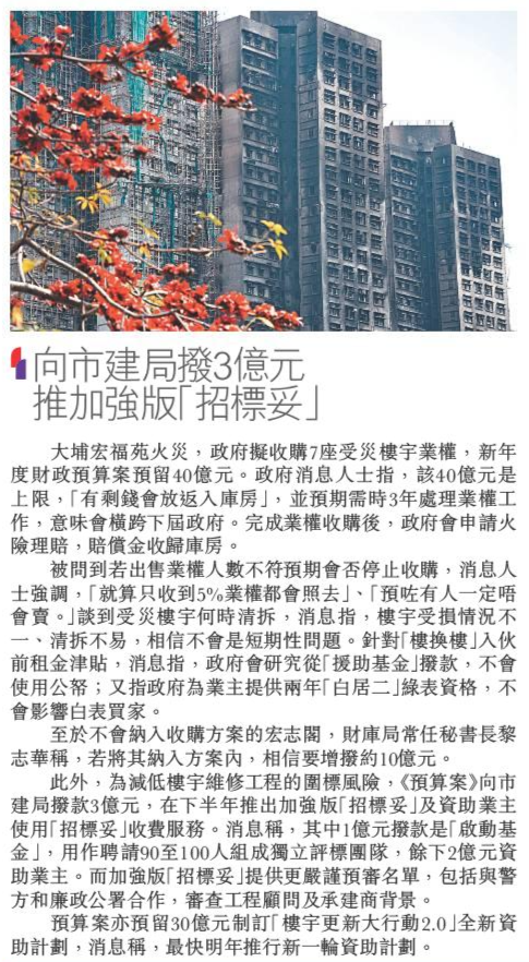 頭條日報 Headline Daily • 26/02/2026 向市建局撥3億元 推加強版「招標妥」 大埔宏福苑火災,政府擬收購7座受災樓宇業權,新年度財政預算案預留40億元。政府消息人士指,該40億元是上限,「有剩錢會放返入庫房」,並預期需時3年處理業權工作,意味會橫跨下屆政府。完成業權收購後,政府會申請火險理賠,賠償金收歸庫房。