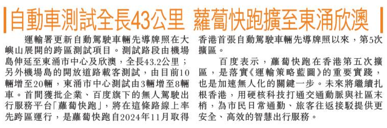 頭條日報 Headline Daily • 25/02/2026 自動車測試全長43公里 蘿蔔快跑擴至東涌欣澳 運輸署更新自動駕駛車輛先導牌照在大嶼山展開的跨區測試項目。首家獲批企業、百度旗下的無人駕駛出行服務平台「蘿蔔快跑」,將在這條路線上率先跨區運行,是蘿蔔快跑自2024年11月取得香港首張自動駕駛車輛先導牌照以來,第5次擴區。