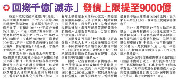 頭條日報 Headline Daily • 26/02/2026 回撥千億「滅赤」 發債上限提至9000億 政府財政狀況結束連續3年「見紅」,新年度預算案顯示,2025/26年綜合帳目錄得29億元盈餘,好過原先預料的670億元赤字;而預計2026/27年綜合盈餘為221億元。不過,根據預算案附錄,真實財政狀況並非充裕,2025/26年收入近6888億元,支出近7892億元,錄得逾1004億元赤字,政府是透過發行1550億元債券,扣除還債逾517億後,才抵銷千億赤字,得出「盈餘」。