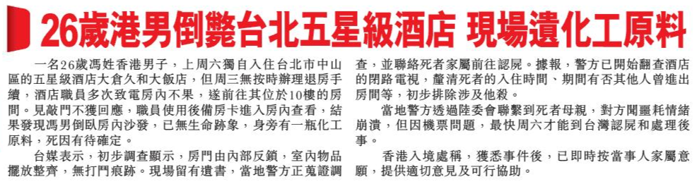 頭條日報 Headline Daily • 20/02/2026 26歲港男倒斃台北五星級酒店 現場遺化工原料 一名26歲馮姓香港男子,上周六獨自入住台北市中山區的五星級酒店大倉久和大飯店,但周三無按時辦理退房手續,酒店職員多次致電房內不果,遂前往其位於10樓的房間。見敲門不獲回應,職員使用後備房卡進入房內查看,結果發現馮男倒臥房內沙發,已無生命迹象,身旁有一瓶化工原料,死因有待確定。