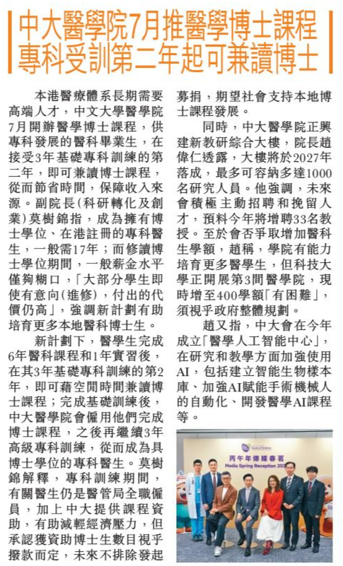 頭條日報 Headline Daily • 24/02/2026 中大醫學院7月推醫學博士課程 專科受訓第二年起可兼讀博士 本港醫療體系長期需要高端人才,中文大學醫學院7月開辦醫學博士課程,供專科發展的醫科畢業生,在接受3年基礎專科訓練的第二年,即可兼讀博士課程,從而節省時間,保障收入來源。