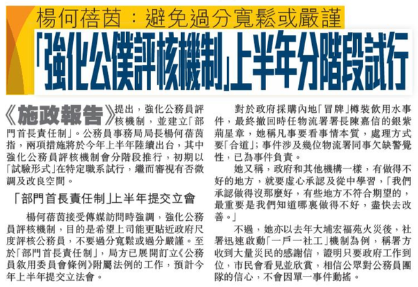 頭條日報 Headline Daily • 20/02/2026 楊何蓓茵:避免過分寬鬆或嚴謹 「強化公僕評核機制」上半年分階段試行 《施政報告》提出,強化公務員評核機制,並建立「部門首長責任制」。公務員事務局局長楊何蓓茵指,兩項措施將於今年上半年陸續出台,其中強化公務員評核機制會分階段推行,初期以「試驗形式」在特定職系試行,繼而審視有否微調及改良空間。