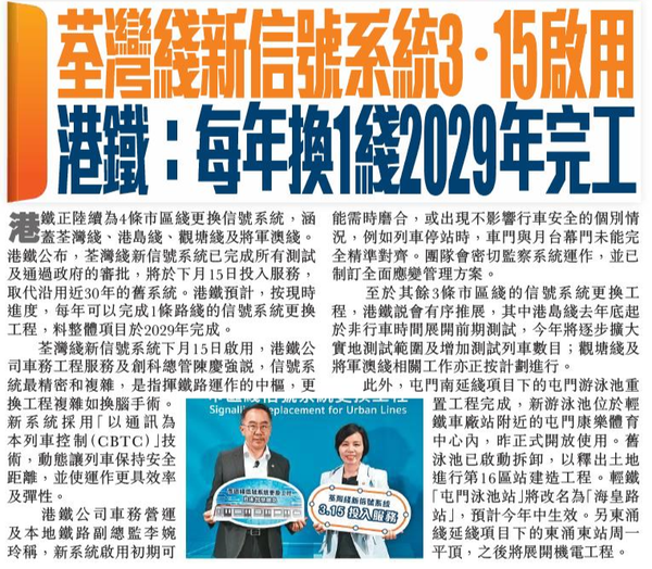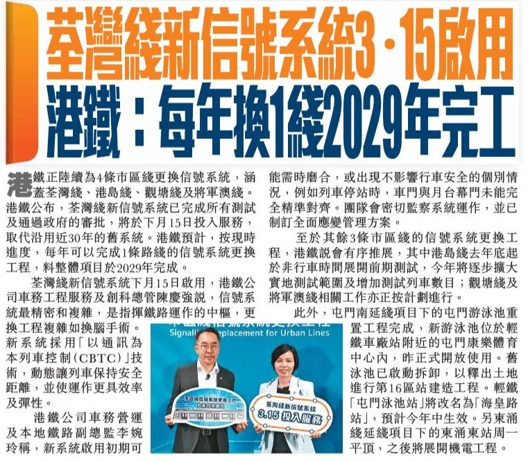 頭條日報 Headline Daily • 25/02/2026 荃灣綫新信號系統3.15啟用 港鐵:每年換1綫2029年完工 港鐵正陸續為4條市區綫更換信號系統,涵蓋荃灣綫、港島綫、觀塘綫及將軍澳綫。港鐵公布,荃灣綫新信號系統已完成所有測試及通過政府的審批,將於下月15日投入服務,取代沿用近30年的舊系統。港鐵預計,按現時進度,每年可以完成1條路綫的信號系統更換工程,料整體項目於2029年完成。
