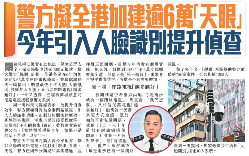 頭條日報 Headline Daily • 16/02/2026 警方擬全港加建逾6萬「天眼」 今年引入人臉識別提升偵查 閉路電視已證實有助執法,保障公眾安全。保安局擬申請40.6億元撥款,擴大警方「銳眼」計劃,全港各區在6年內加裝約6.65萬支閉路電視鏡頭。警務處處長周一鳴指出,期望最快今年內把「人臉識別」技術加入系統,又形容閉路電視「越多越好」。一哥又透露,已經有商場願意將閉路電視接駁至警方系統。