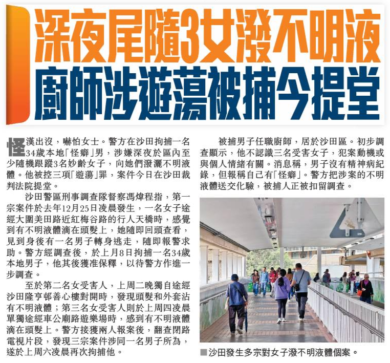 頭條日報 Headline Daily • 23/02/2026 深夜尾隨3女潑不明液 廚師涉遊蕩被捕今提堂 怪漢出沒,嚇怕女士。警方在沙田拘捕一名34歲本地「怪癖」男,涉嫌深夜於區內至少隨機跟蹤3名妙齡女子,向她們潑灑不明液體。他被控三項「遊蕩」罪,案件今日在沙田裁判法院提堂。