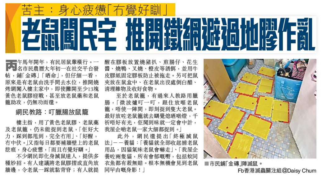 頭條日報 Headline Daily • 20/02/2026 苦主:身心疲憊「冇覺好瞓」 老鼠闖民宅 推開鐵網避過地膠作亂 丙午馬年開年,有民居鼠輩橫行。一名市民農曆大年初一在社交平台發帖,鋪「金磚」「晒命」,但仔細一看,原來是有老鼠由洗手間去水位,推開燒烤網闖入樓主家中,即使攤開至少13塊黃色老鼠膠迎戰,甚至放老鼠藥和老鼠籠助攻,仍無功而還。