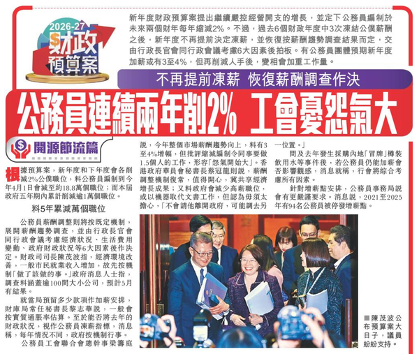 頭條日報 Headline Daily • 26/02/2026 不再提前凍薪 恢復薪酬調查作決 公務員連續兩年削2% 工會憂怨氣大 新年度財政預算案提出繼續嚴控經營開支的增長,並定下公務員編制於未來兩個財年每年縮減2%。不過,過去6個財政年度中3次凍結公僕薪酬之後,新年度不再提前決定凍薪,並恢復按薪酬趨勢調查結果而定,交由行政長官會同行政會議考慮6大因素後拍板。有公務員團體預期新年度加薪或有3至4%,但再削減人手後,變相會加重工作量。