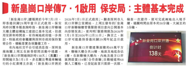 頭條日報 Headline Daily • 16/02/2026 新皇崗口岸傳7.1啟用 保安局:主體基本完成 「新皇崗口岸」據報將於今年7月1日、即香港回歸29周年當日正式啟用。保安局昨回覆本報查詢時指,新皇崗口岸聯檢大樓主體結構施工建設已基本完成,但啟用安排和時間表,有待兩地政府進一步商討。特區政府會繼續與深圳市政府保持緊密合作,積極落實各項籌備工作。