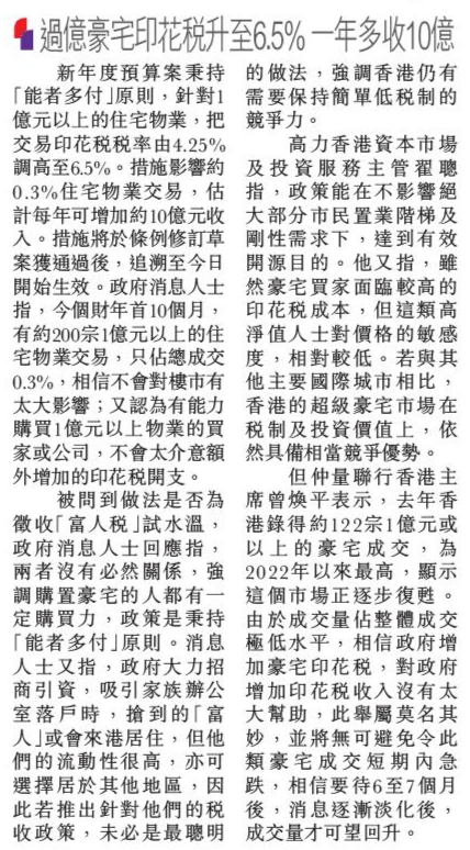 頭條日報 Headline Daily • 26/02/2026 過億豪宅印花稅升至6.5% 一年多收10億 新年度預算案秉持「能者多付」原則,針對1億元以上的住宅物業,把交易印花稅稅率由4.25%調高至6.5%。措施影響約0.3%住宅物業交易,估計每年可增加約10億元收入。措施將於條例修訂草案獲通過後,追溯至今日開始生效。