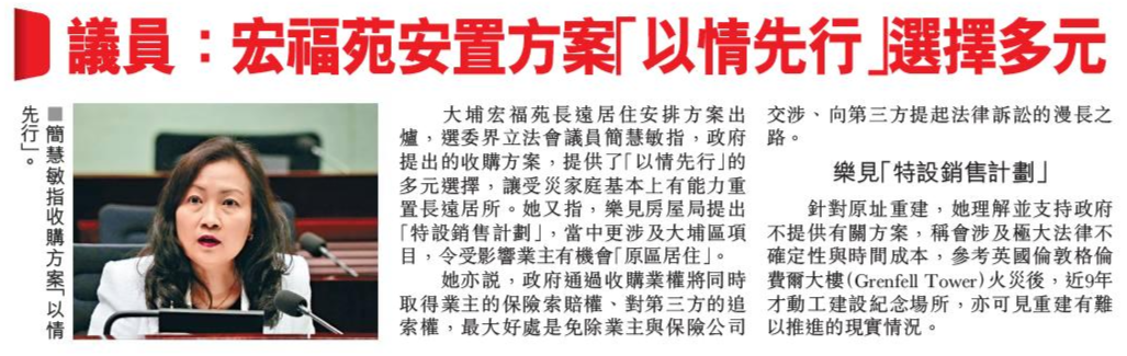 頭條日報 Headline Daily • 23/02/2026 議員:宏福苑安置方案「以情先行」多元選擇 大埔宏福苑長遠居住安排方案出爐,選委界立法會議員簡慧敏指,政府提出的收購方案,提供了「以情先行」的多元選擇,讓受災家庭基本上有能力重置長遠居所。她又指,樂見房屋局提出「特設銷售計劃」,當中更涉及大埔區項目,令受影響業主有機會「原區居住」。