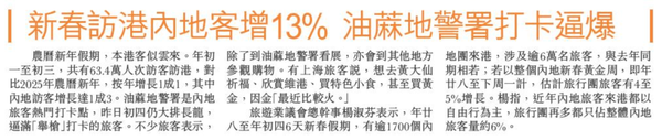 頭條日報 Headline Daily • 21/02/2026 新春訪港內地客增13% 油蔴地警署打卡逼爆 農曆新年假期,本港客似雲來。年初一至初三,共有63.4萬人次訪客訪港,對比2025年農曆新年,按年增長1成1,其中內地訪客增長達1成3。油蔴地警署是內地旅客熱門打卡點,昨日初四仍大排長龍,逼滿「舉槍」打卡的旅客。