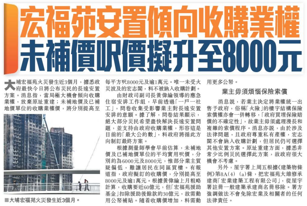 頭條日報 Headline Daily • 21/02/2026 宏福宛安置傾向收購業權 未補價呎價擬升至8000元 大埔宏福苑火災發生近3個月,據悉政府最快今日將公布災民的長遠安置方案。消息指,當局極大機會傾向收購業權,放棄原址重建;未補地價及已補地價單位的收購業權價,將分別提高至每平方呎8000元及逾1萬元。唯一未受火災波及的宏志閣,料不被納入收購計劃。