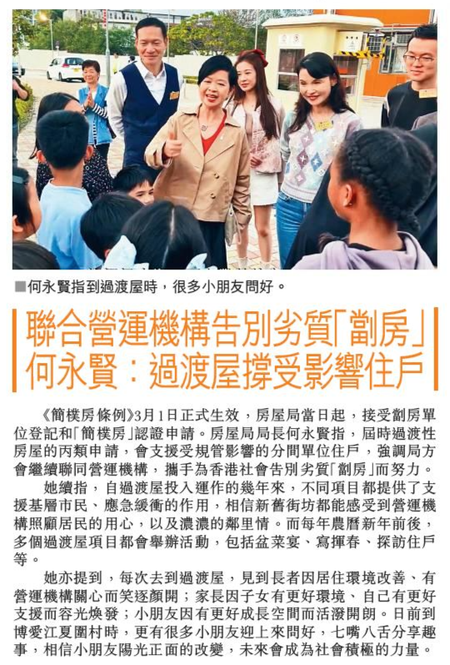 頭條日報 Headline Daily • 20/02/2026 聯合營運機構告別劣質「劏房」 何永賢:過渡屋撐受影響住戶 《簡樸房條例》3月1日正式生效,房屋局當日起,接受劏房單位登記和「簡樸房」認證申請。房屋局局長何永賢指,屆時過渡性房屋的丙類申請,會支援受規管影響的分間單位住戶,強調局方會繼續聯同營運機構,攜手為香港社會告別劣質「劏房」而努力。