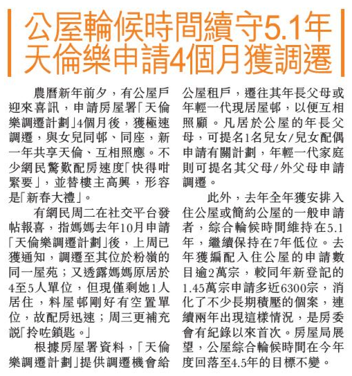 頭條日報 Headline Daily • 13/02/2026 公屋輪候時間續守5.1年 天倫樂申請4個月獲調遷 農曆新年前夕,有公屋戶迎來喜訊,申請房屋署「天倫樂調遷計劃」4個月後,獲極速調遷,與女兒同邨、同座,新一年共享天倫、互相照應。不少網民驚嘆配房速度「快得咁緊要」,並替樓主高興,形容是「新春大禮」。